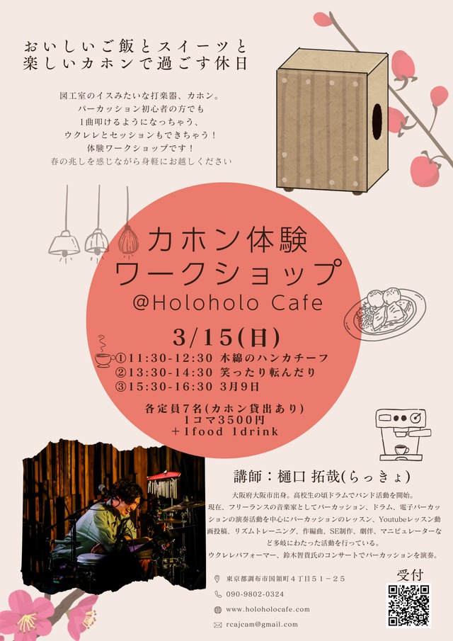 図工室のイスみたいな打楽器、カホン。 パーカッション初心者の方でも1曲叩けるようになっちゃう ウクレレとセッションもできちゃう体験ワークショップです! 講師:らっきょ(樋口 拓哉) 会場:Holoholo Cafe(京王線国領駅徒歩10分、バス停「国領八丁目」徒歩2分) (〒182-0022 東京都調布市国領町4丁目51−25) https://maps.app.goo.gl/3RcX6ptqgkFb2k3GA ※2/5(金) 18:00から受付を開始します!!※ ①11:30~12:30 課題曲「桜(コブクロ)」 ②13:30~14:30 課題曲「ハナミズキ」 ③15:30~16:30 課題曲「チェリー」 備考: ・11:30~12:30の枠の方は12:30以降、 13:30~14:30の枠の方は14:30以降、 15:30~16:30の枠の方は16:30以降の時間で1フード、1ドリンクのご注文をお願いします。 ・このページでは受講代のみのお支払いとなり、飲食代は当日会場でのお支払いになります。 ・カホン貸し出しします。もしご自身のをお持ちの方はぜひお持ちください。 ・持参していただくものは基本ありません。 ・楽器の特性上パンツスタイルでの服装でのご来場をお願いします。 ・ワークショップ終了後は参加者の皆さんと一緒にHoloholo Cafeの美味しい料理とドリンクを頂けたらと思います。